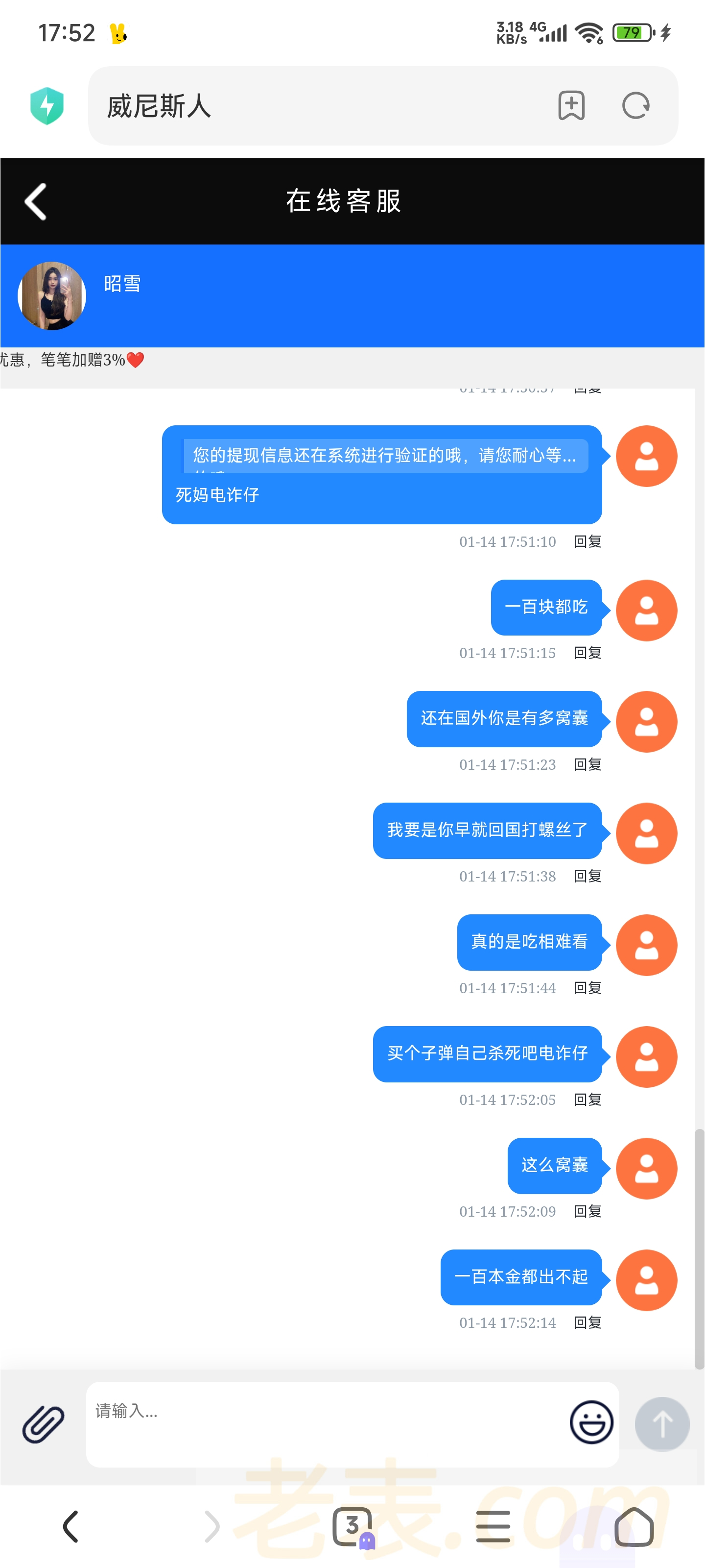 292.cc黑台来的上个月开始提现到现在都没到,一百本金赢了三百多一直提现处理中然后账号又可以登录进去没封就提现一直在处理中,问客服就会一直说系统验证中,每次回都是一句话跟机器人一样,现在的台真的是吃相难看几百块都出不去还在国外搞电诈要是我早就回国打螺丝了