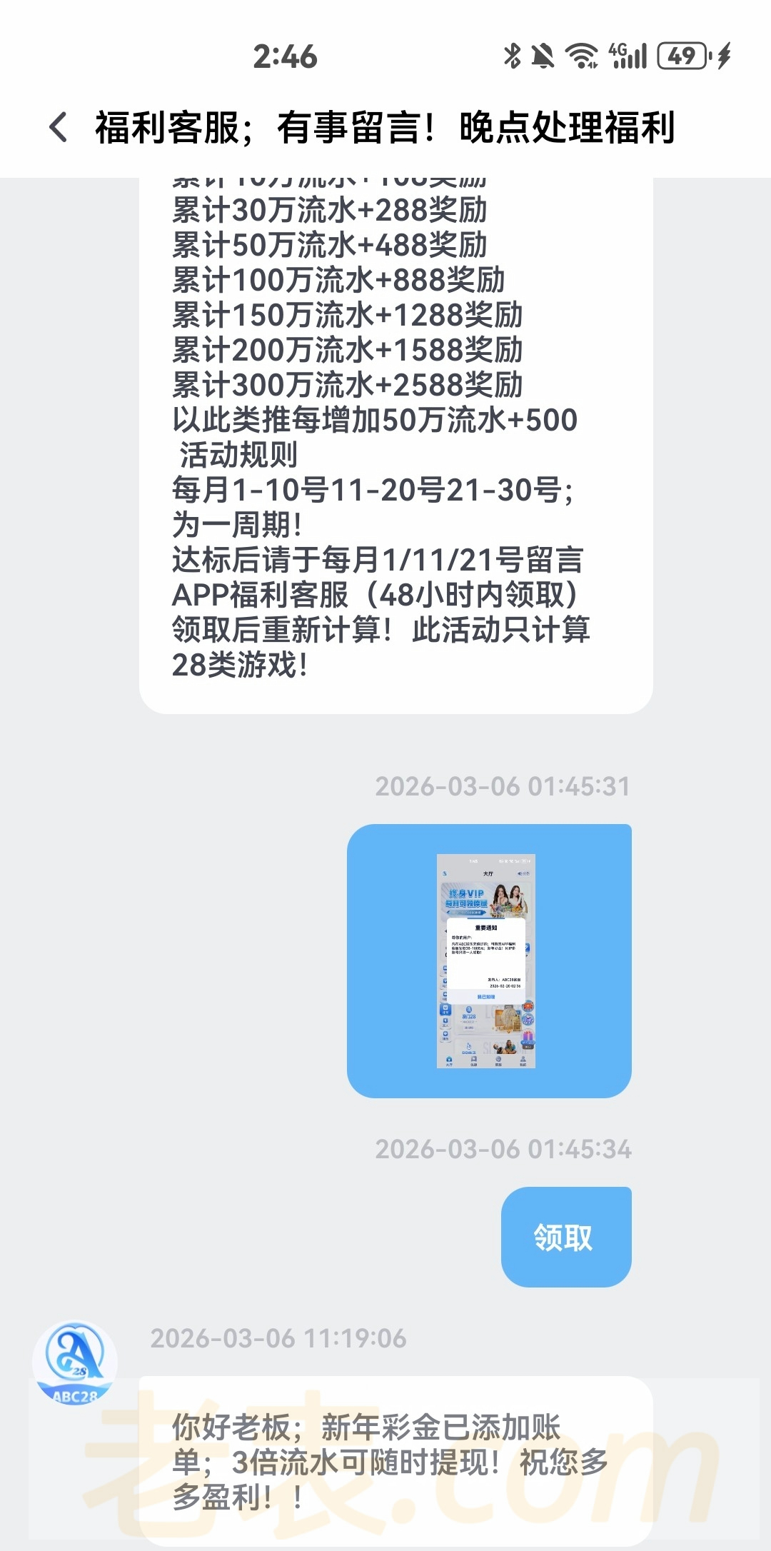 上个月19号领了58,今天月礼金上号看见公告联系福利客服又领了38